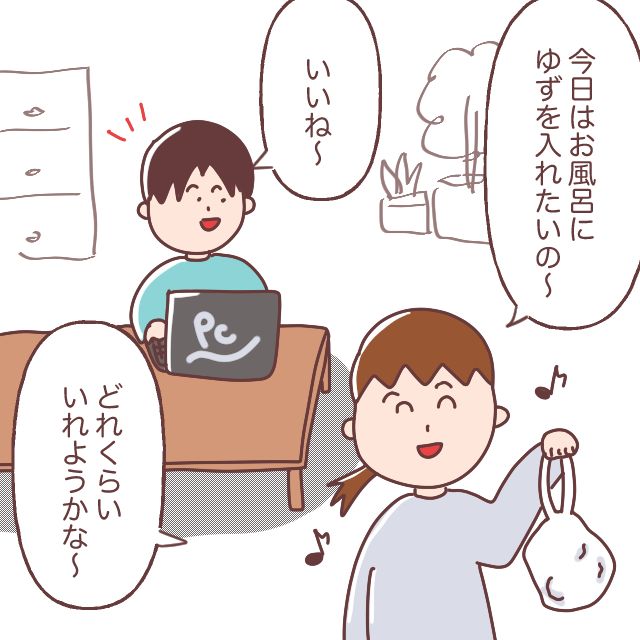 冬至の日にスーパーでゆずを買ってきた妻。「今日はお風呂にゆずを入れたいの~どれくらい入れようかな~」そう言って、袋いっぱいのゆずを僕に嬉しそうに見せてきます。