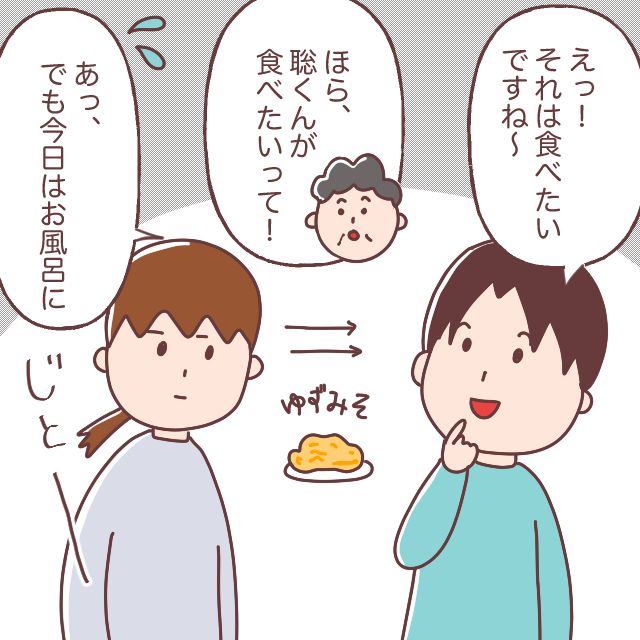 柚子味噌と聞いて、心が揺らいでしまった僕。思わず「えっ!それは食べたいですね~」と、つい本音が出てしまいました。そのひと言を義母が聞き逃すはずもなく、「ほら、聡くんが食べたいって!」と嬉しそうに妻に向かって言います。その瞬間、妻の視線は僕へ。僕は慌てて「あっ、でも今日はお風呂に・・・」と軌道を修正します。