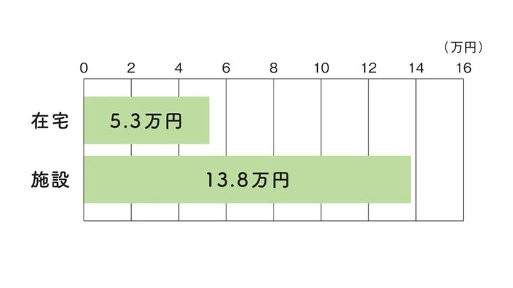 介護をどこで行うかによって、月々の負担額は大きく変わります。介護を行った場所別にみると、在宅が平均 5.3万円、施設が平均 13.8万円(いずれも月額)。施設入居を検討する場合は、平均よりも余裕を持った予算を見積もる必要があります。