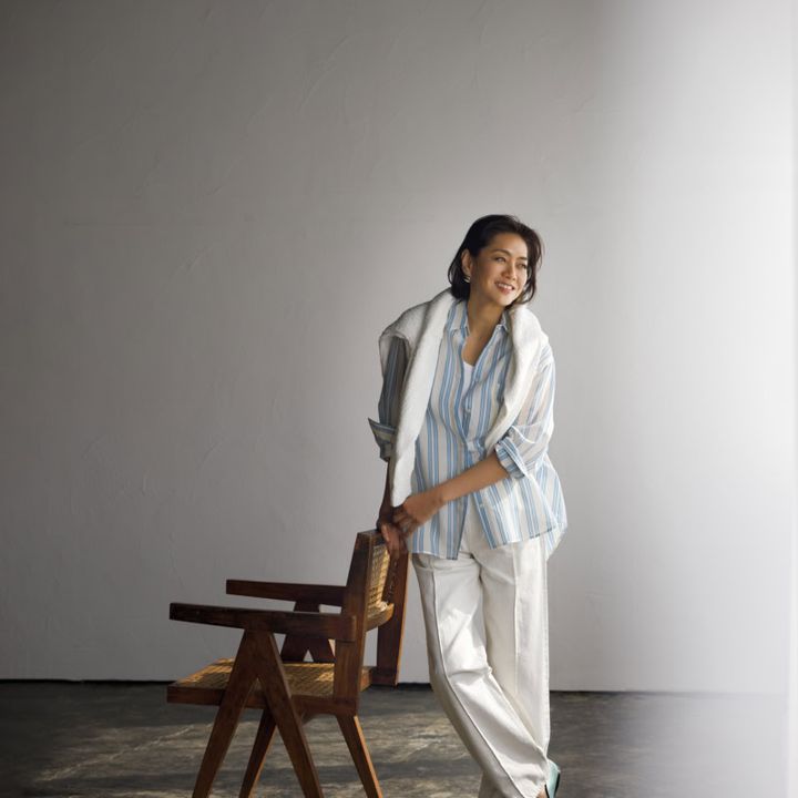 シャツ¥104,500/アッシュ(コロネット)、肩にかけたニット¥64,900、パンツ¥53,900/ともにドゥロワー(ドゥロワー 青山店)、タンクトップ/スタイリスト私物、ピアス¥47,300/ウノアエレ シルバーコレクション(ウノアエレ ジャパ ン)、靴¥115,500/セルジオ ロッシ (セルジオ ロッシ ジャパン カスタマーサービス)