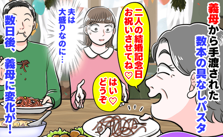 義母「2人の結婚記念日お祝いさせて♡」私の皿に数本の具なしパスタがチョン。夫は大盛り!?夫に相談した結果