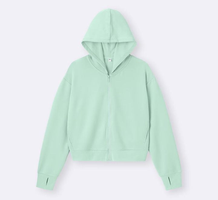 少し短めの丈感と、紫外線を90%以上カットするUVカット機能、接触冷感機能が特徴のフルジップパーカです。サムホール付きで手の甲まで隠せます。