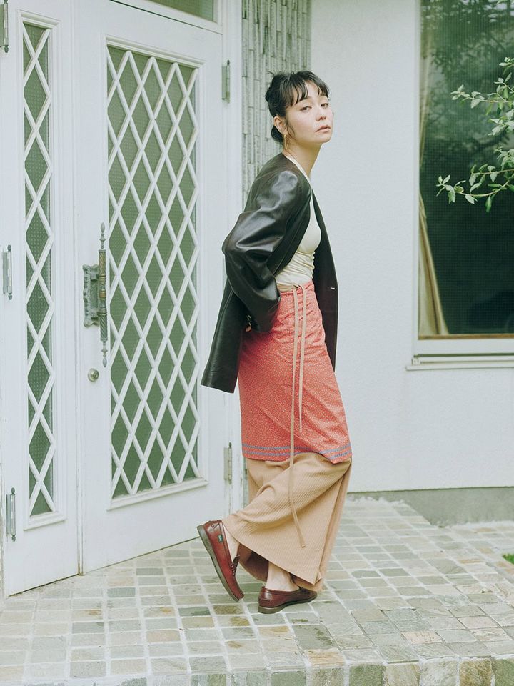 スカート¥20,900(SEA/エスストア)、ジャケット¥49,500(プランクプロジェクト/プランクプロジェクト 青山店)、トップス¥18,150、下に着たスカート¥22,770(共にベースレンジ/ベースレンジ ジャパン)、ピアス¥19,800(メラキ/フラッパーズ)、ローファー¥44,000(パラブーツ/パラブーツ青山店)