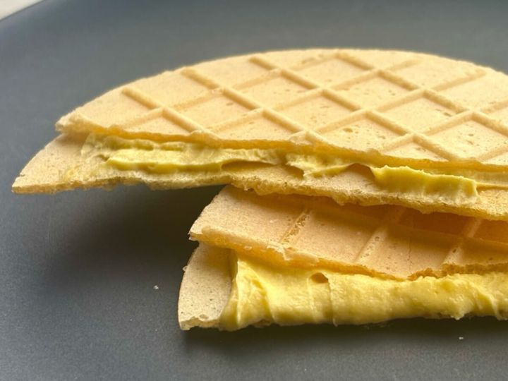 パリッと割ってみると、トラフグの粉末が混ぜ込まれたチーズクリームがはさまっています。気になるトラフグとゴーフレットのコラボは、一瞬ゴーフレットの甘さが来たと思いきや、フグの上品な風味が最後に口の中を一瞬通ります。フグとゴーフレットの甘じょっぱさが病みつきになる人は多そうです。
