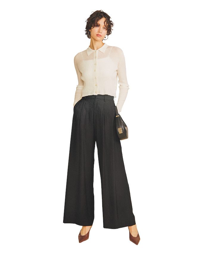 歩くたびになびくすそがエレガントな黒のワイドパンツ。 すそに向かって贅沢に広がるシルエットがドラマティックなドレープを生み、重厚感のある黒に、しなやかな女性らしさを宿していく。