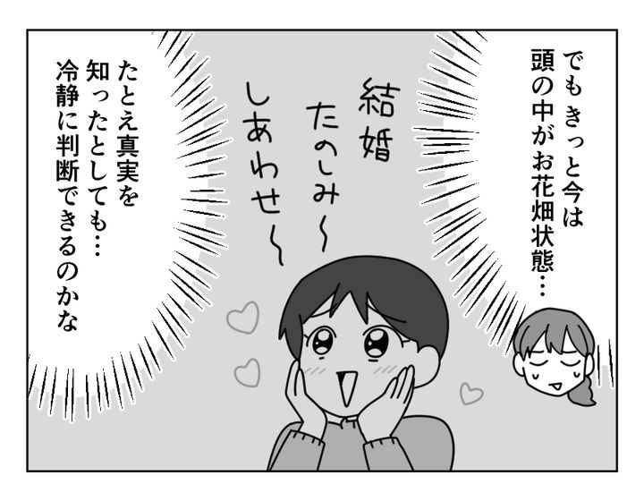 そうなのです! ユキナさんとマサユキさんとの間にある思い出は、どんな黒歴史であっても所詮「過去のこと」なのです。マサユキさん自身が心を入れ替えているのだとしたら、ユキナさんからのアドバイスは元夫の結婚を阻止するための「告げ口」と捉えられてしまうかもしれません。現状が分からない以上、安易に過去のことを話すわけにはいかないな……ユキナさんはそう思うのでした。