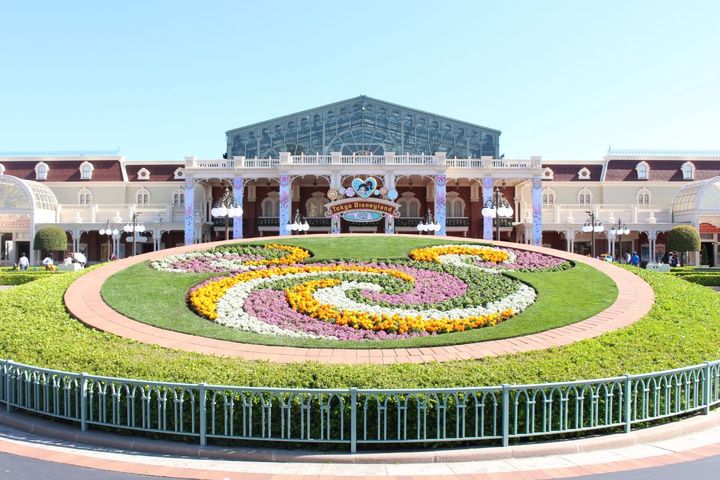 期間中はパーク内もお菓子でいっぱい! パークに入るとまず目に入るミッキー花壇は、キャンディーみたいな渦巻き模様! ワールドバザールのショーウィンドウなどもヴァネロペ一色です。
