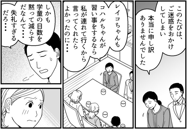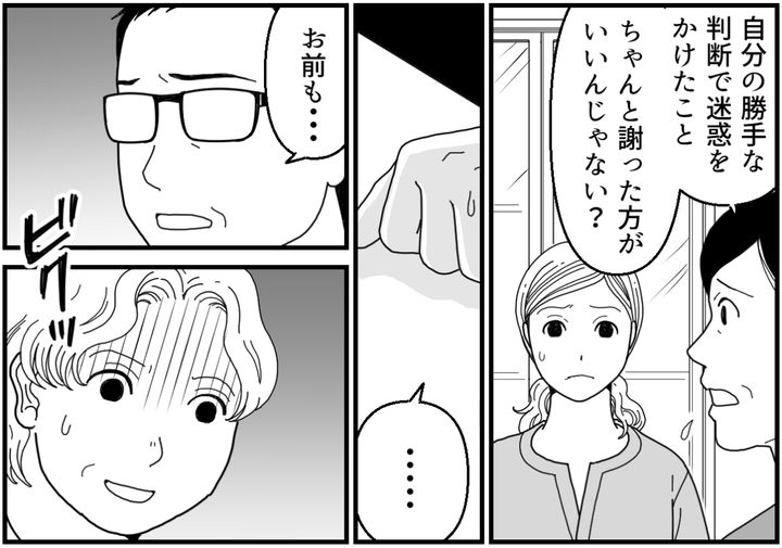 ダイスケくんのご両親は「ご迷惑をおかけしてしまい申し訳ありませんでした」と深々と頭を下げてくれました。けれどレイコちゃんと義母は「チカさんが大げさにした」と私を責めます。するとダイスケくんが「いい加減にしろ」と怒り出しました。