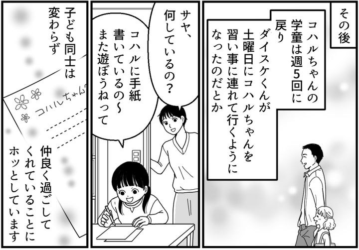 子ども同士は相変わらず仲が良さそうなので安心しています。大人の事情を子ども同士の関係に持ち込まないように、これからも子どもたちのことは温かく見守っていきたいと思います。