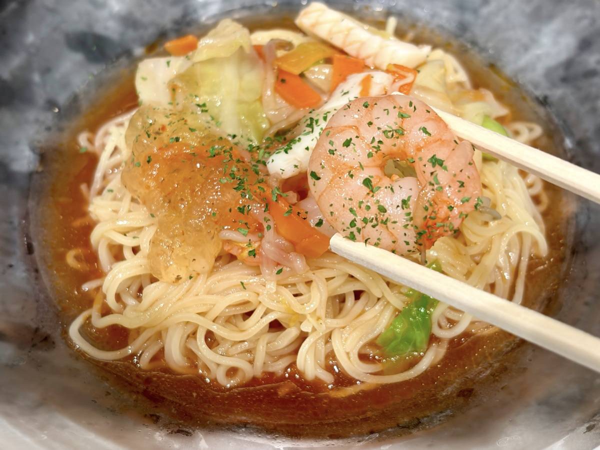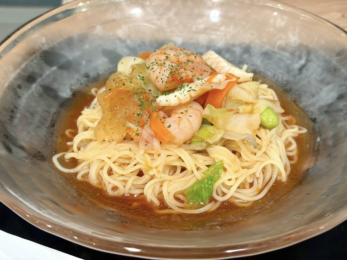 トマトベースのスープに海鮮の旨みを合わせた、洋風仕立ての冷たい麺です♪