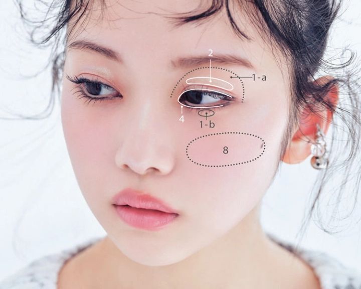 1-aをアイホール全体に、1-bを黒目の下につける。2を目のきわをはずした二重の線上にのせる。4で上下の目のきわをぐるっと囲む。