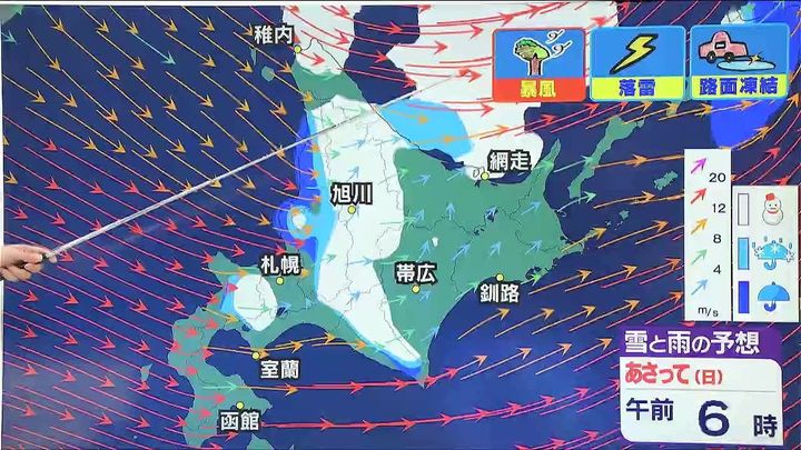 朝から夜のはじめ頃にかけて稚内や羽幌方面で暴風に警戒が必要です。午後は広く雨が降り、夜は雪に変わるでしょう。路面凍結に注意して下さい。