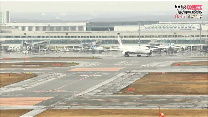 背景は10日午後5時ごろの新千歳空港情報カメラ