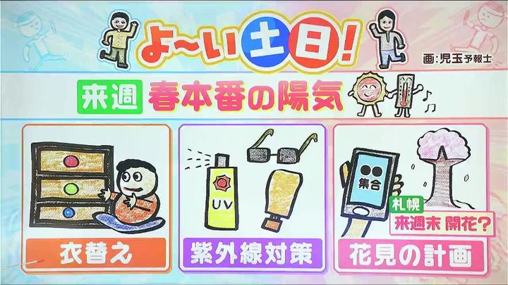 晴れて気温が上がるので、衣替えを進めましょう。4月に入って紫外線が強まってきているので、日焼け止めや日傘、サングラスも用意しましょう。札幌では、来週末にもサクラが開花するかもしれません。花見の計画は早めに立てましょう。