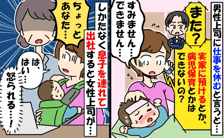 「ちょっとあなた…」男性上司に言われて発熱中の息子を連れて出勤した私。女性上司が激怒したワケとは