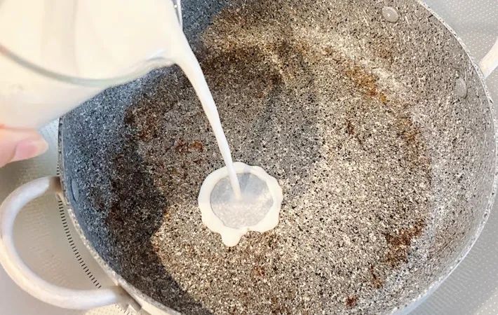 ウインナーを炒めた鍋に牛乳を注ぎ、沸騰しないように気をつけて温めていきます。