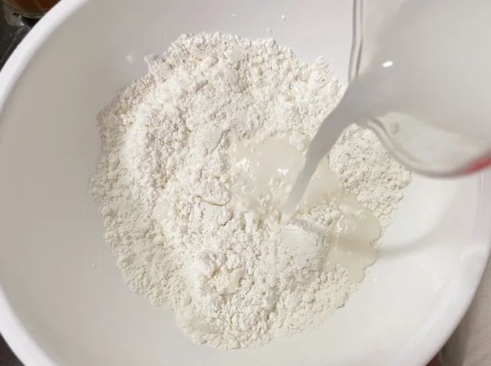 粉類をすべて混ぜてから、牛乳と水を注いでいきます。