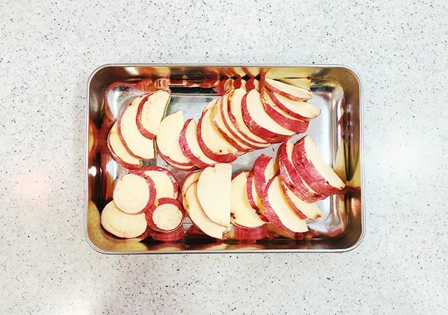 まず、サツマイモを5~8mmの厚さの輪切りに切っていきます。