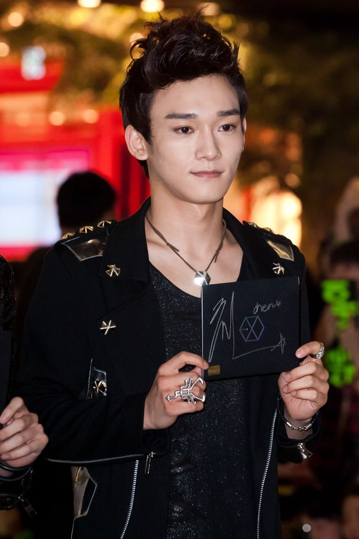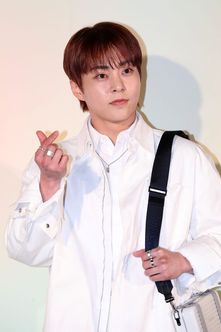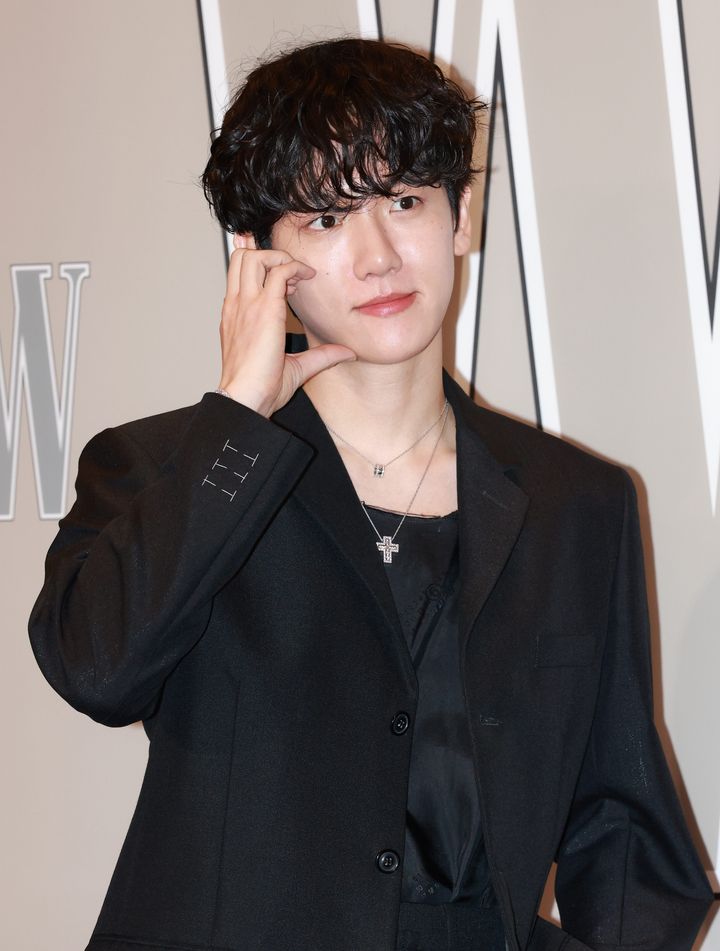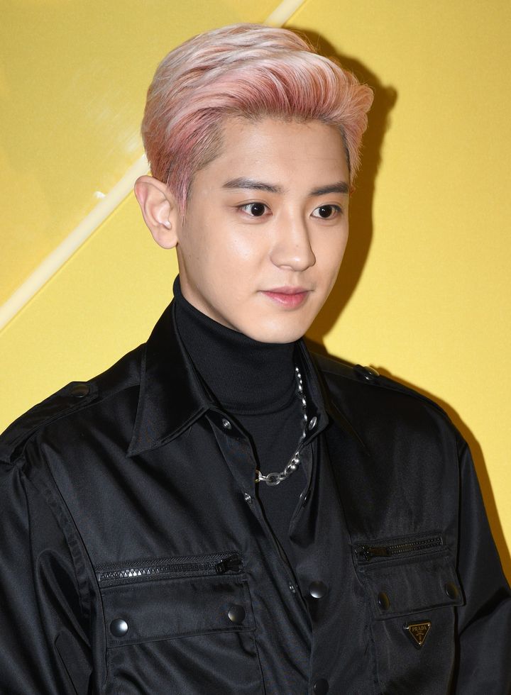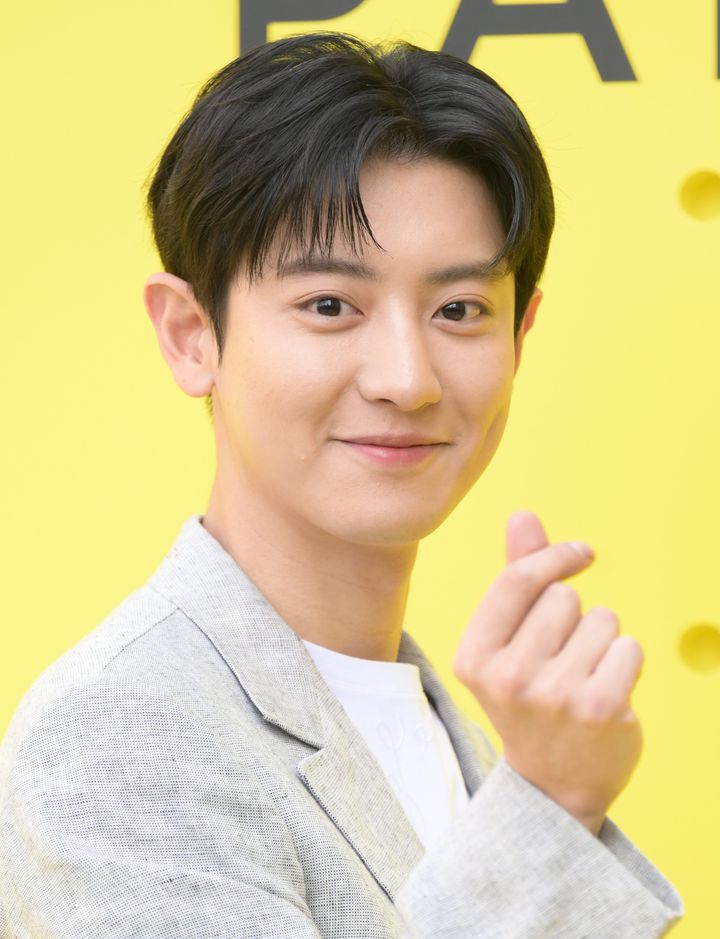 高さのあるアップバングがインパクト抜群のヘアで、ファンイベントに登場したチェン。アイラインで目元を囲み、力強いまなざしを強調。