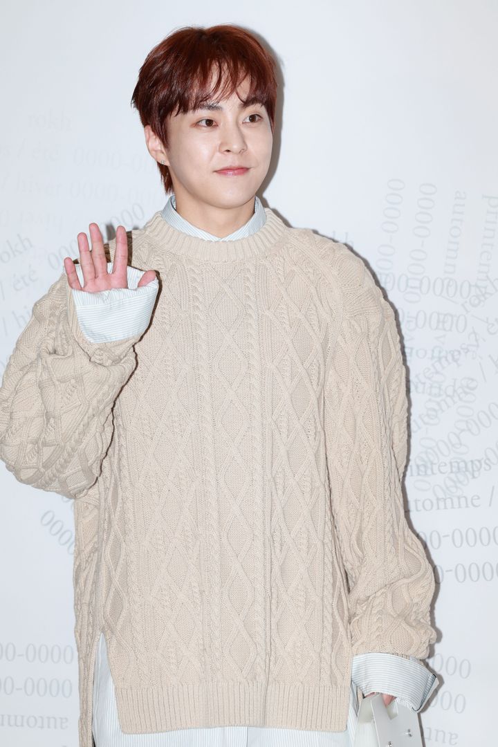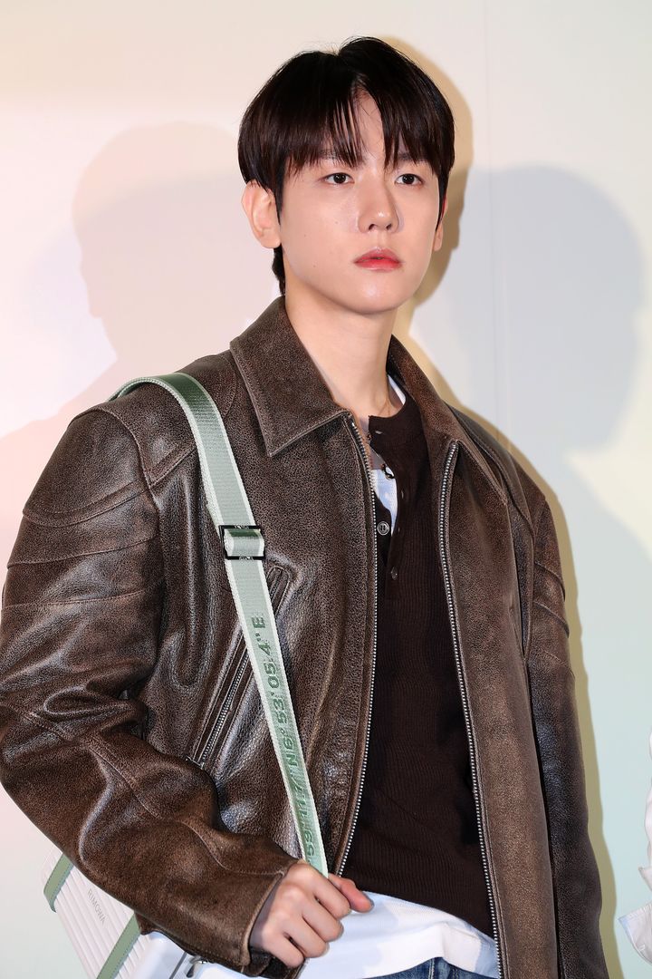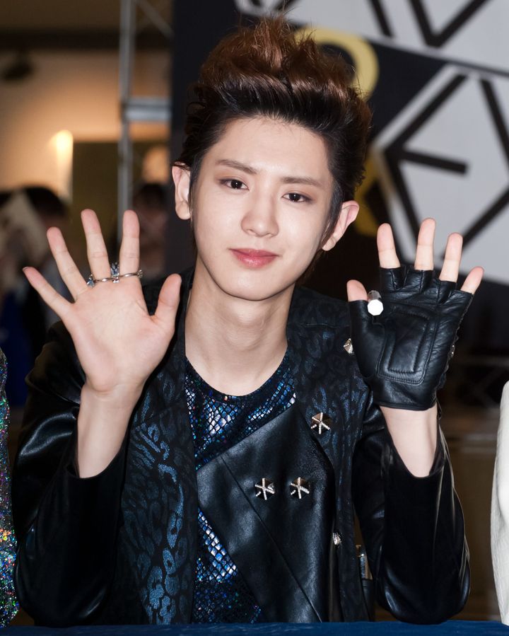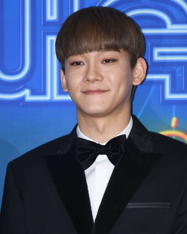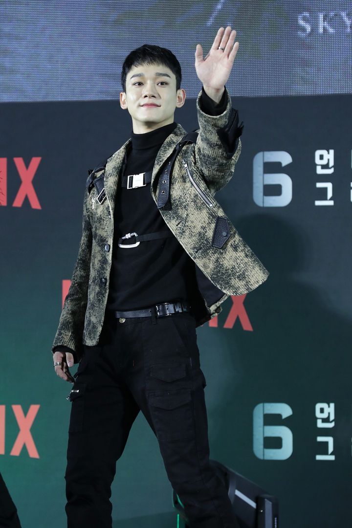 高さのあるアップバングがインパクト抜群のヘアで、ファンイベントに登場したチェン。アイラインで目元を囲み、力強いまなざしを強調。