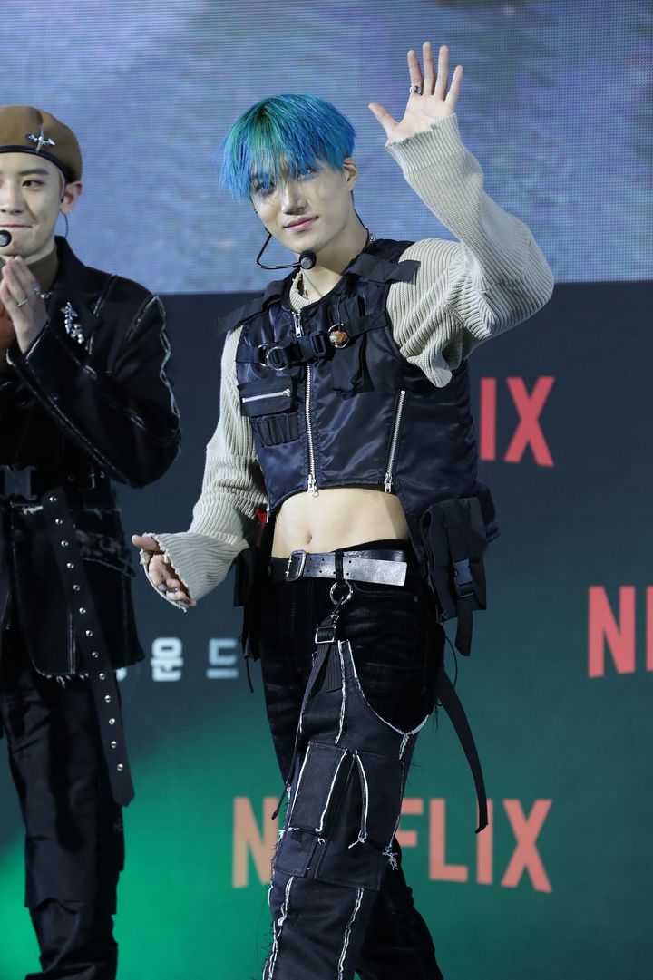 ソウルで行われたNetflix「6アンダーグラウンド」ワールドプレミアにて。「Obesession」では神秘的なブルーヘアでカムバックしたカイ。ファンを悩殺した腹筋見せスタイルが話題に! 曲のコンセプトに合わせて運動と食事管理を徹底し、62kgまで減量したそう。