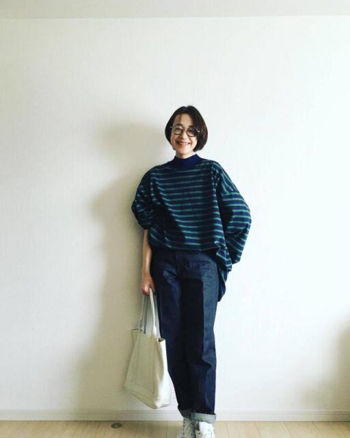 定番のデニムパンツも習い事の行き帰りに使えます。50代のカジュアル派さんにおすすめなのが、濃いめのインディゴカラー&ワイドシルエットのデニム。ここに合わせるトップスは体のラインが出ないよう、ゆったりめのトップスをチョイス。親しみやすく動きやすいコーデに決まりますよ。
