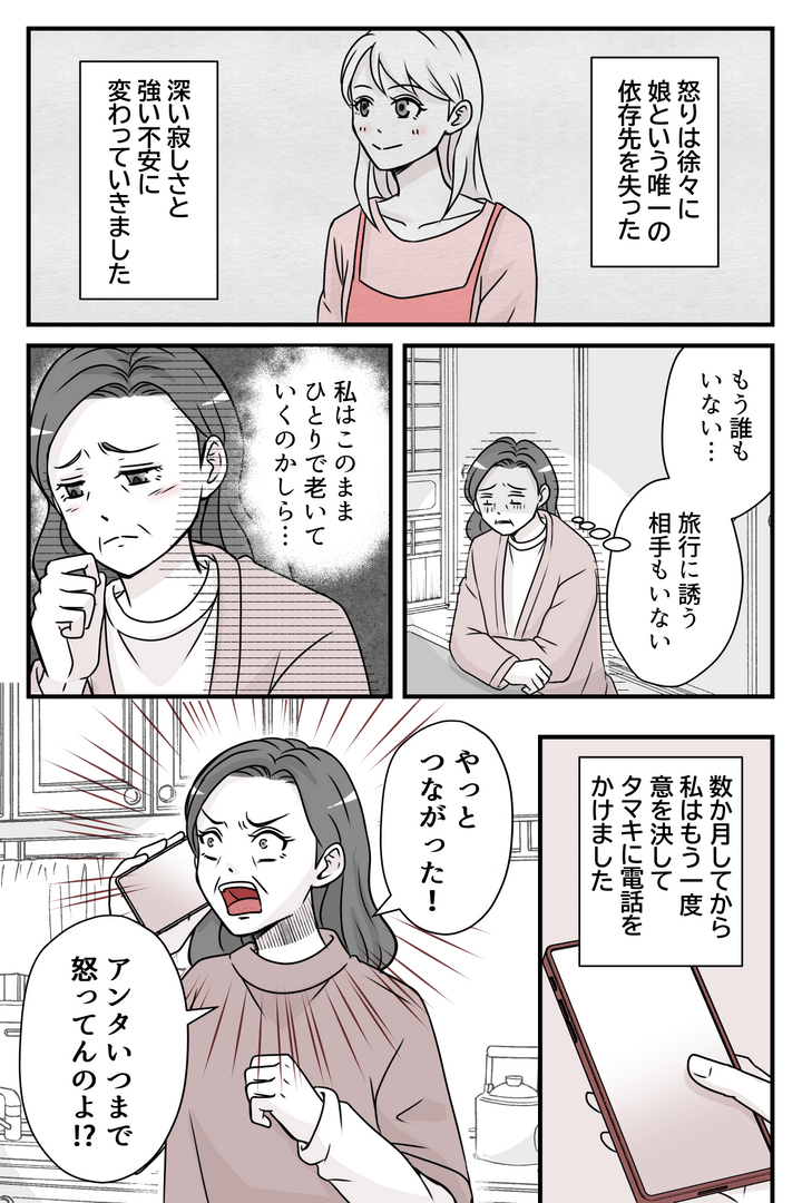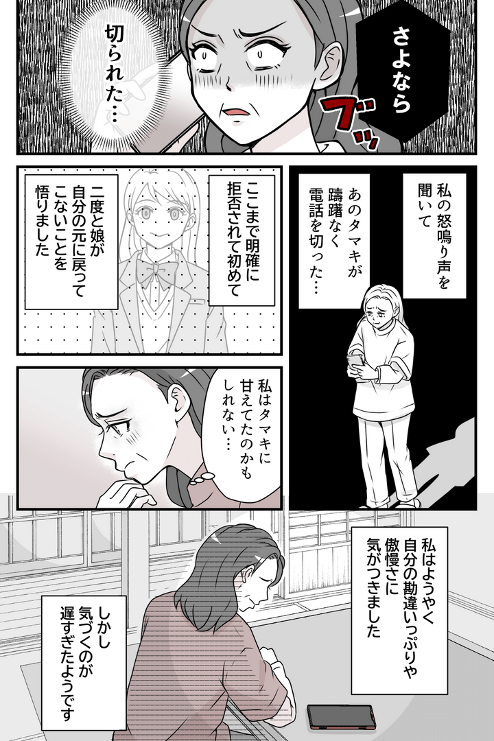 数か月後、やっと電話が繋がったタマキに「今度は怒鳴らないから」と再び旅行に誘います。しかしタマキは冷たく拒否。つい言い返した途端、躊躇なく電話を切られてしまいました。私はタマキに甘え、傲慢にもいつまでも暴言が許されると思い込んでいました。