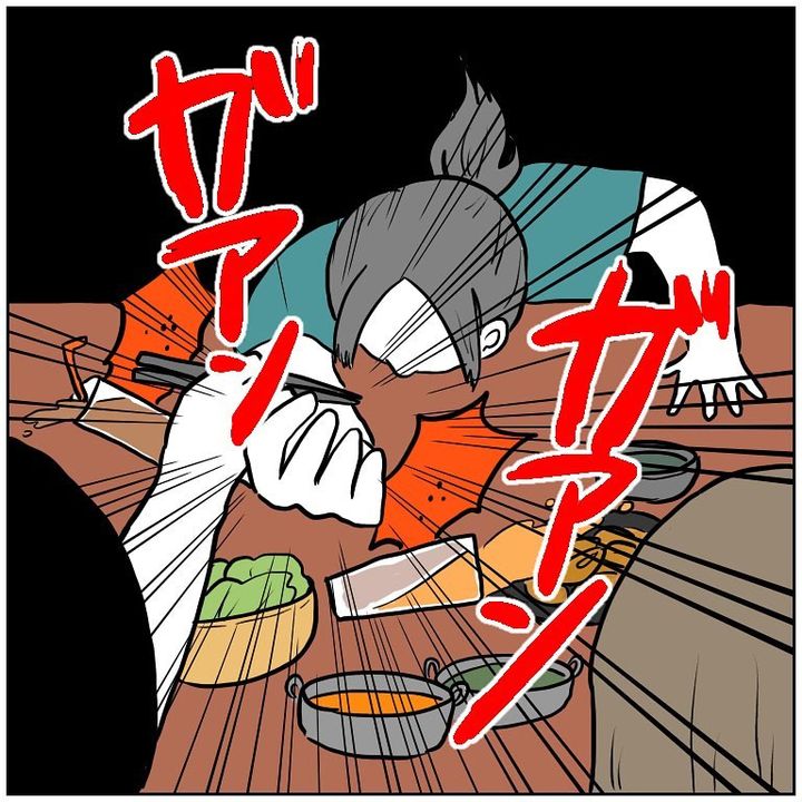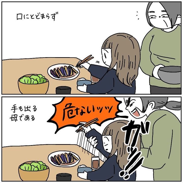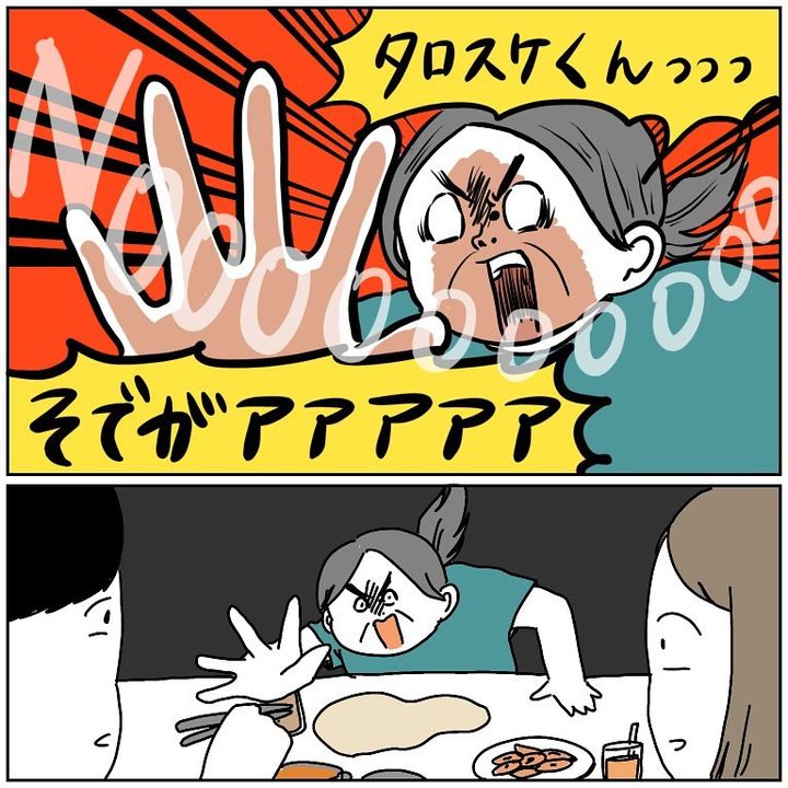 こんにちは!Instagramで日々の暮らしを漫画で紹介している、Web漫画家のmomoです。わたしの母は昔から世話焼きで、他人の危険を察知したら過剰な勢いで防ごうとする習性があります。先日も食事中に、夫の危機を防ごうとした母。そのエクストリームな反応が大惨事を招き…!?