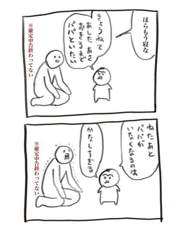 「パパといたい」と息子さんに言われてしまっては、そうしてあげたいところですが、確定申告の期限は待ってくれません。息子さんのかわいい願いとの間で揺れる犬犬さんの気持ちが、痛いほど伝わってきます…。