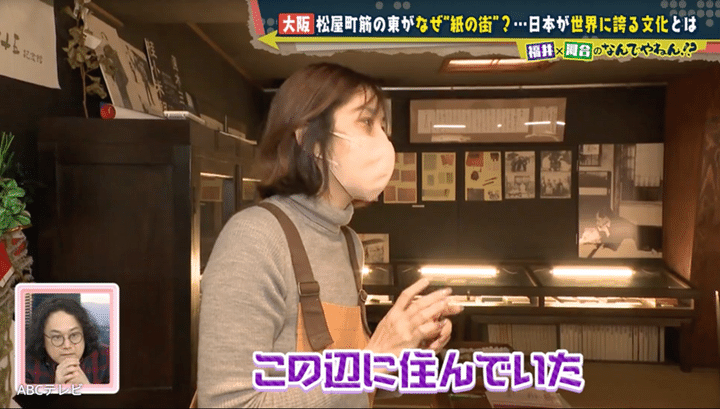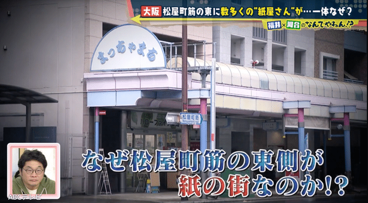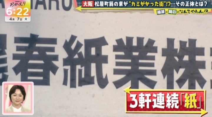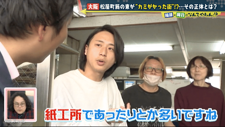 “カミがかった街”のカミとは、神? それとも髪? 推理を巡らしながら松屋町筋の東側を調査し始めた河合と福井アナは、社名に「紙」が付く会社を3軒連続で発見!他にも印刷屋さんなど紙にまつわる会社が次々と現れ、紙を加工する工場で話を聞くと、かつてこの辺りにはもっと多くの紙関連会社があったという証言が得られた。
