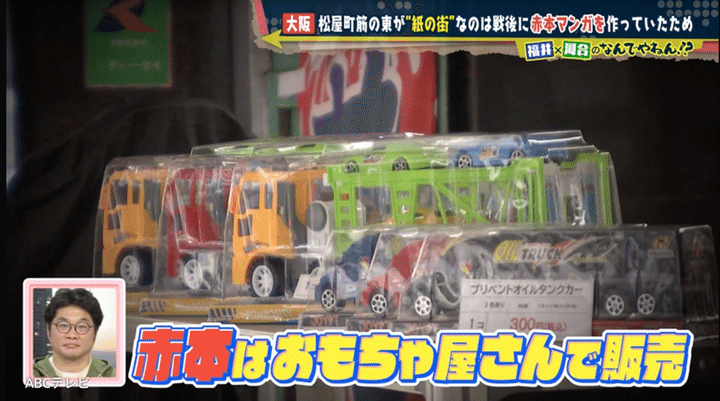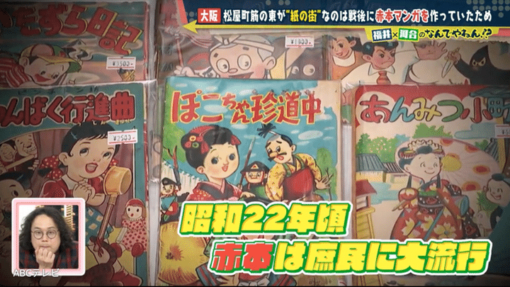 「赤本」とは戦後間もない頃、粗悪な紙で作られ、表紙に赤色を多用したマンガ本のこと。当時、正規の書店では扱われず、主にオモチャ屋さんで売られていた。つまり松屋町筋で売られていた「赤本」を作っていたのが東側にあった紙屋さん。戦後の資材不足でまともな本が出版されない中、印刷屋さんで余った用紙や粗悪な紙を使って安価で製本したのだとか。