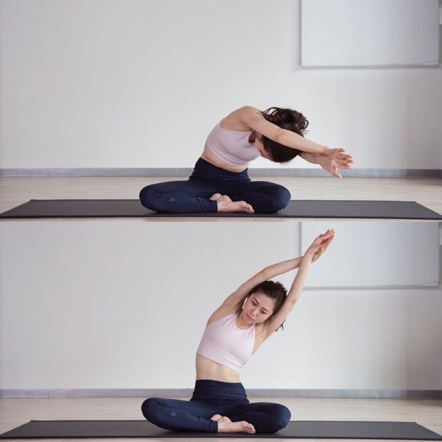 あぐらで座り、両腕をまっすぐ上へ。頭上で腕を軽く交差させ、手のひらを重ねます。骨盤を立て、背骨を上に引き上げるように意識。左右のウエストの長さをそろえ、“まっすぐ立つ軸”をつくります。