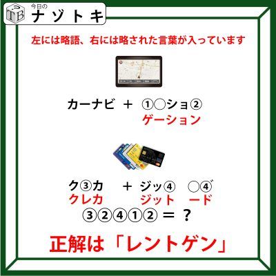そこで考えるべきなのは「カーナビ」という言葉です。「カーナビ」は「カーナビゲーション」を略した言葉です。右の見えている文字から推測すると略された文字が右には書かれていそうです。