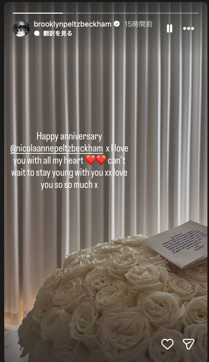 ちなみに4月10日(金)はブルックリンと愛妻ニコラ・ペルツの4回目の結婚記念日。ブルックリンはニコラにブーケとカードをプレゼント、それをSNSに投稿した。カードに「僕たちは多くのことを共に乗り越えてきた」「僕たちはこれまで以上に強い絆で結ばれている」と書かれているのが見て取れる。ブルックリンは両親を非難したとき、デヴィッドとヴィクトリアが「何度も自分たちを別れさせようとした」と主張していた。それだけに、今回のコメントは両親との対決姿勢を改めて示すものだと見るフォロワーも多い。ブルックリンがこれからどんな動きを見せるのか、見守りたい。
