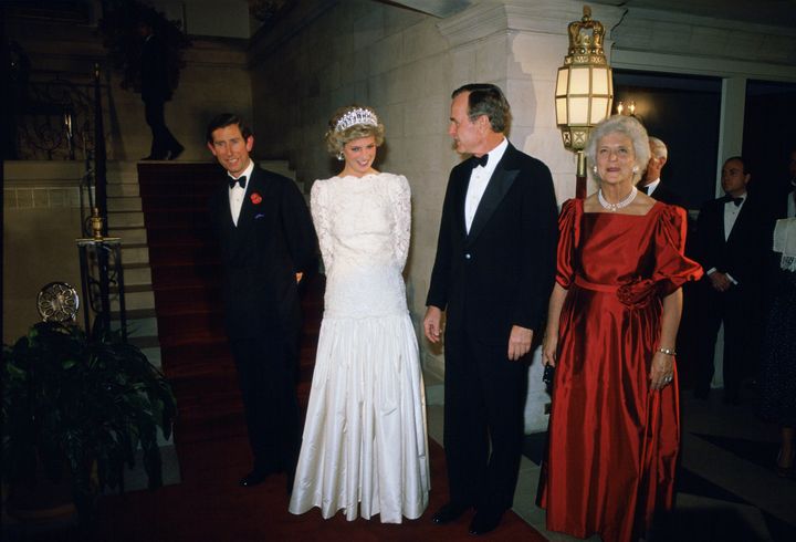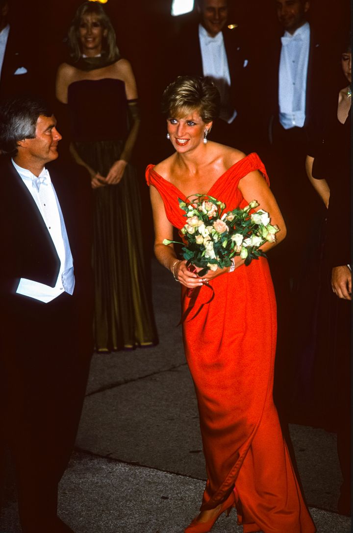 1990年、ワシントンD.C.のロイヤル・ガラで披露したレッドドレスは、彼女の洗練されたスタイルを支えたヴィクター・エデルスタインがデザイン。圧倒的な存在感を放つレッドを、上品&モダンなスタイルでまとめ上げているのがポイント。まさにプリンセスの風格漂うアイコニックな一着です。