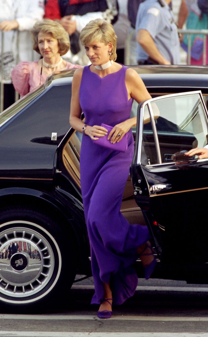 1996年、シカゴ訪問時にまとったのが、公私ともに親交の深かったジャンニ・ヴェルサーチェが手掛けた、鮮やかなパープルのドレス。ボディラインを美しく引き立てるミニマルなコラムシルエットに、計算されたネックラインがモダンな印象。パールのチョーカーを合わせることで、王室の気品とモードな華やぎを融合させています。
