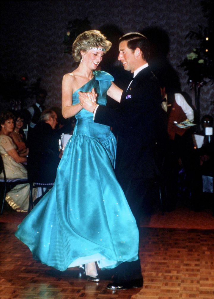 1985年のオーストラリア訪問時のドレスアップより。デヴィッド・ハッセルのエメラルドグリーンのドレスは、光沢のあるサテン地と、片方の肩を大胆に見せたデザインが、当時のロイヤル・ファッションに新風を吹き込みました。注目すべきは伝統的なエメラルドのチョーカーをあえて額に飾ったこと。この斬新さがダンスシーンをより一層ドラマチックに演出しました。