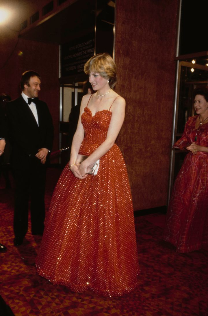 1981年、映画『007/ユア・アイズ・オンリー』のロンドンプレミアでは、ベルヴィル・サスーンのレッドドレスを着用。シフォン素材に繊細なグリッターやビーズがちりばめられたドレスは、歩くたびに煌めきを放ち、周囲の視線をくぎ付けに。結婚間近の彼女の初々しさと、未来のプリンセスとしての存在感を印象付けました。