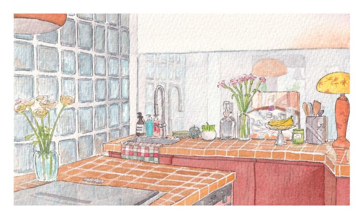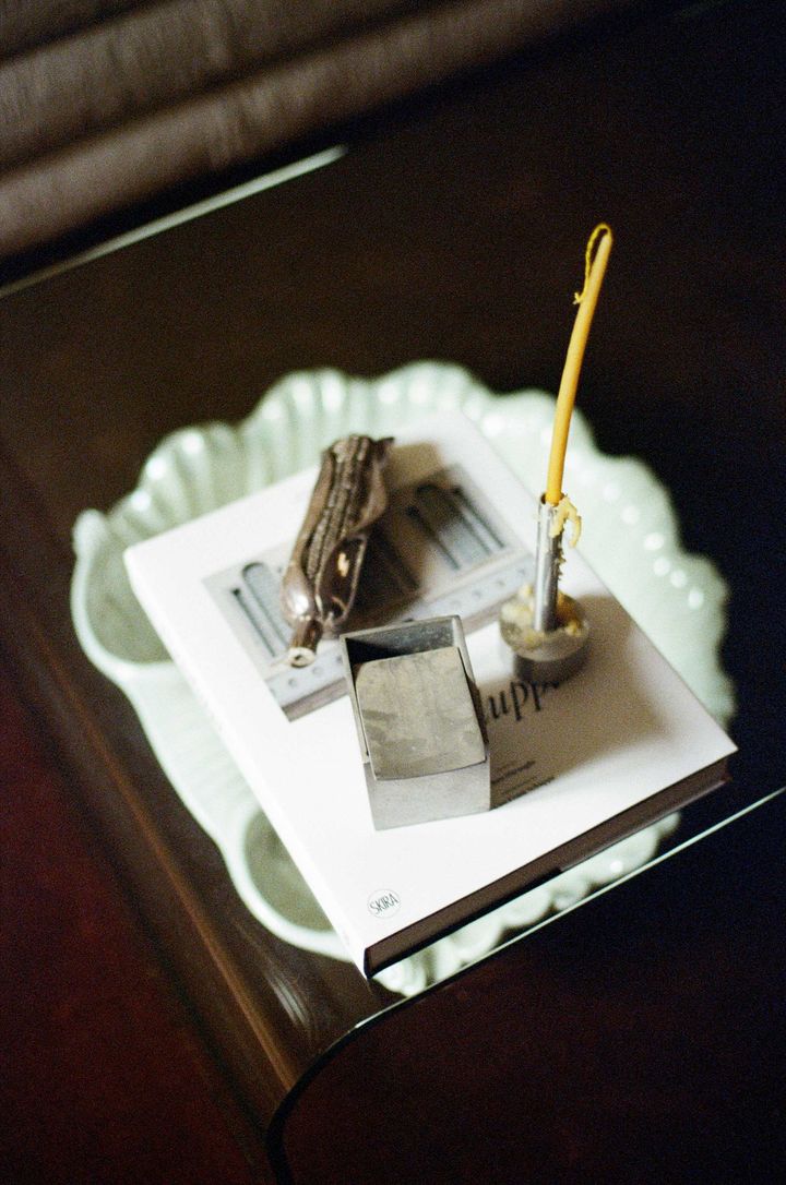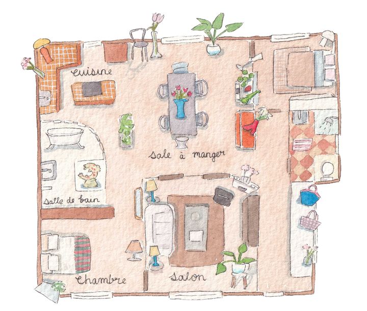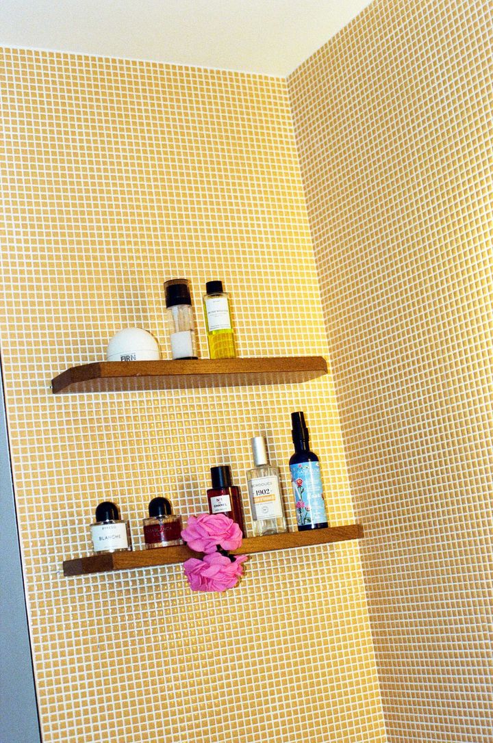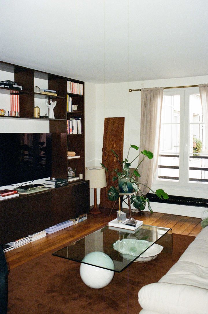 パリ10区にあるアパルトマンに、パートナーと住んでいるカミーユ。2人でリノベーションしたアパルトマンには、住み始めて3ヵ月ほど。リビングは色味をあたたかくし、木の素材をたくさん使っている。お気に入りの本棚には、繊細なデザインのお香立てから、旅に行くたびに集めるストーンなど、さまざまな場所で集めたオブジェが並ぶ。
