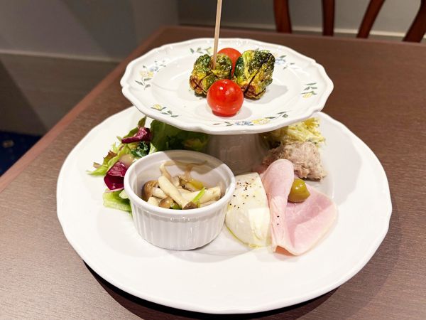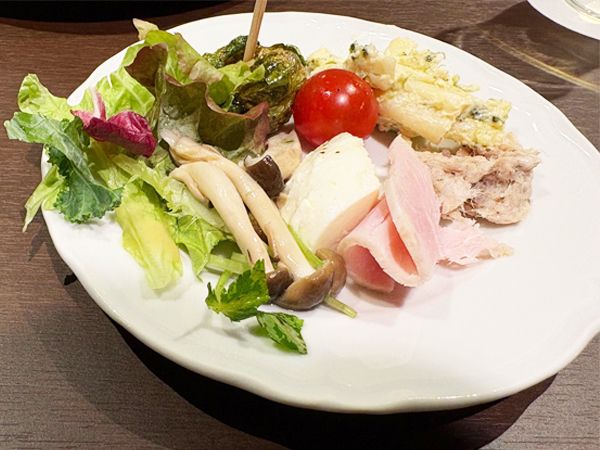 芽キャベツのフリット、プチトマト、グリーンサラダ、キノコのマリネ、モッツァレラチーズ、豚ハムとグリーンオリーブ、リエット、マカロニサラダ。アフタヌーンティーセットのような登場に、ちょっと興奮気味です(笑)。