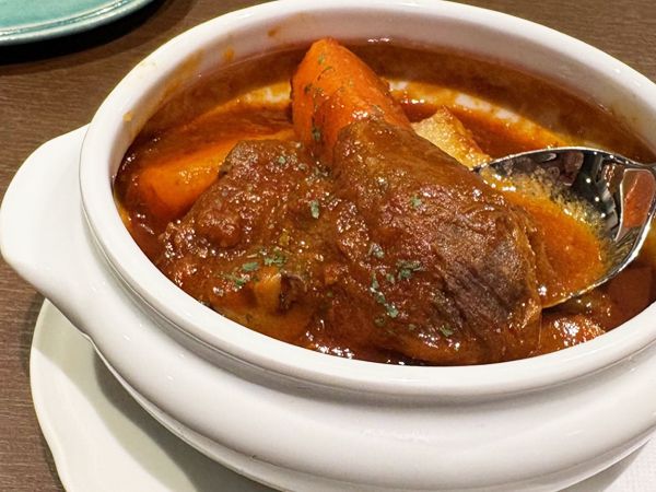 選んだメインは「特製ビーフシチュー」。熱々の器で運ばれてきたビーフシチューは、牛肉がゴロッと入っています。ほかにニンジン、ジャガイモ、マッシュルーム。