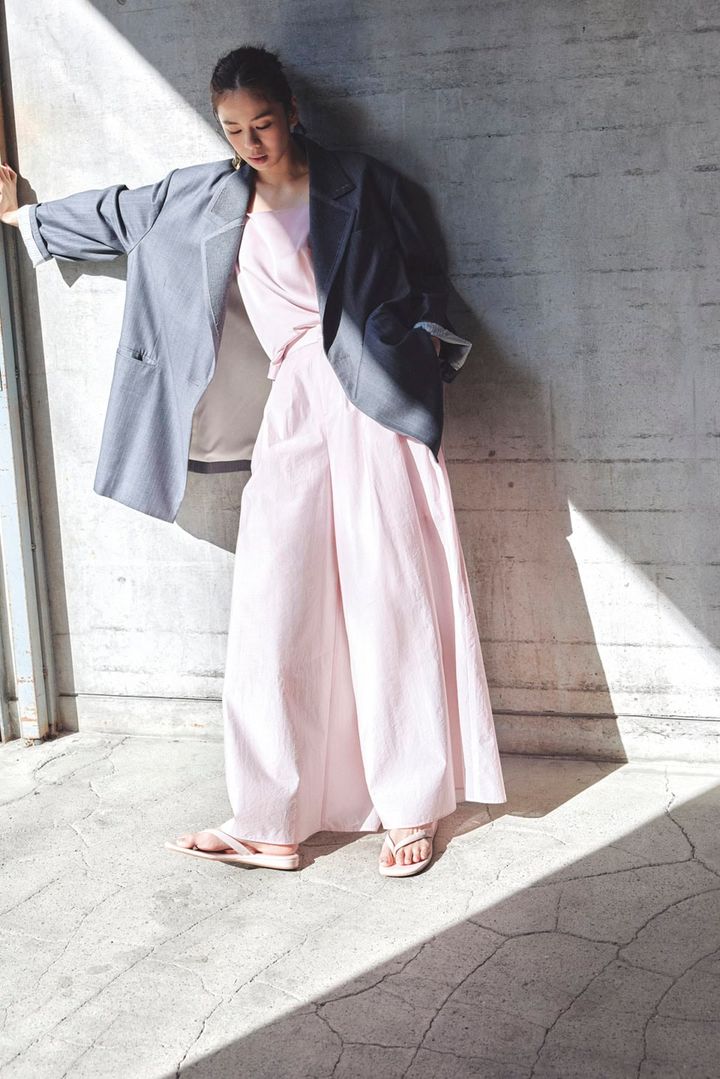 ピュアなパウダーピンクのセットアップは甘さのなかにクリーンなムードも。ピンクに好相性なグレーはビッグジャケットで取り入れてメンズライクに振るのが正解。足元はビーサンでハズしてこなれ感を。