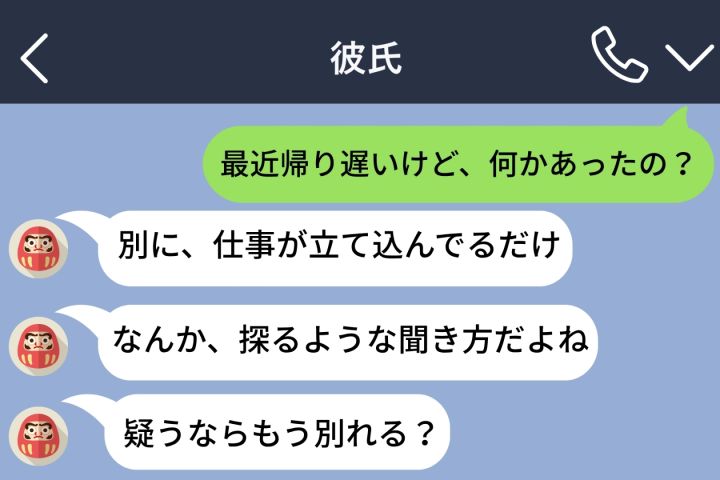 ここ最近、「今日も遅い?」と送っても「うん」という返信が続いていました。水曜日の深夜、もう我慢できなくなって「最近帰り遅いけど、何かあったの?」と送りました。「別に、仕事が立て込んでるだけ」と返ってきました。10分後、彼からまた返信が返ってきました。「なんか、探るような聞き方だよね」という返信に、責めているわけじゃないと返信しかけた瞬間、「疑うならもう別れる?」。私は何も言えなくなりました。