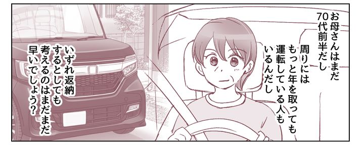私はマリ(38歳)。夫(40歳)と、保育園児の子どもたちとの4人家族です。私たちが暮らしているのは地方都市の郊外で、生活するには車が必須です。そんなある日、母(72歳)が免許返納を考えていると言い出しました。なんでも兄夫婦に勧められたそうです。ただフルタイム共働きの毎日は、母に子どもの送迎をしてもらわないと回らないときだってあります。母の運転になにも問題はないし、免許返納なんてはるか先の話だと思っていましたが……?