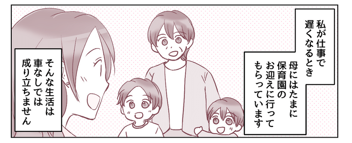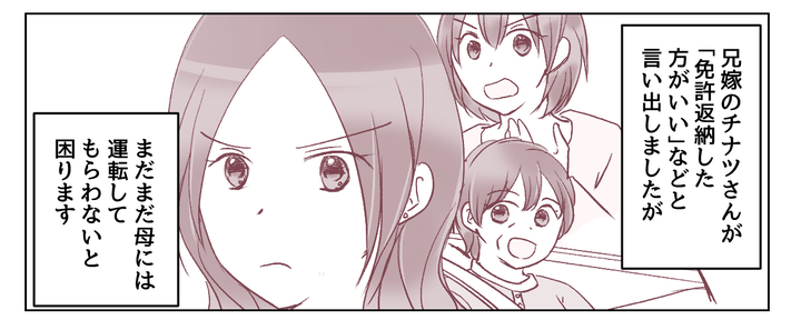 今まで母の運転が危ないなんて思ったことはありません。兄嫁のチナツさんは心配性だから、ちょっとしたことを大げさに捉えているんでしょう。私は母の運転を信頼しているし、子どもたちのお迎えに行ってもらうこともあります。