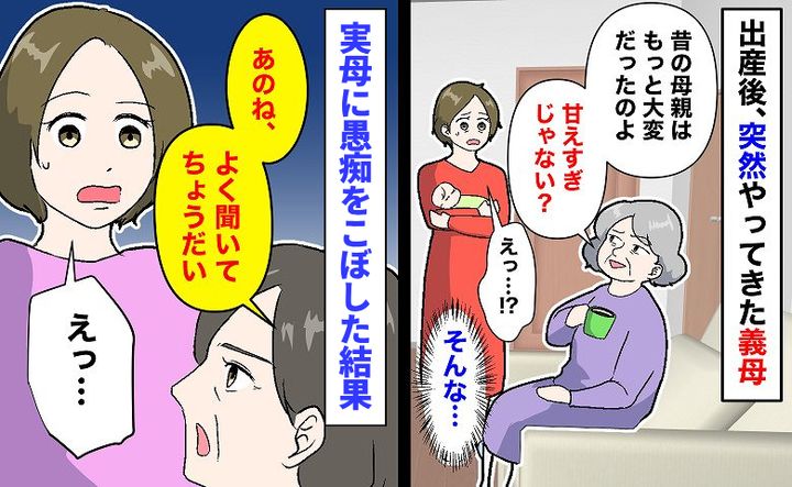 義母「甘えすぎじゃない?昔の母親はね…」慣れない育児に必死の私に心ない言葉…実母に愚痴った結果?