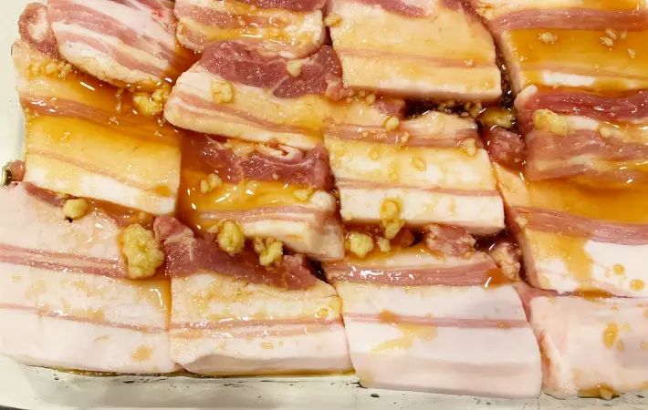 まずは豚バラブロックを一口大にカットし、深めの耐熱容器に並べます。