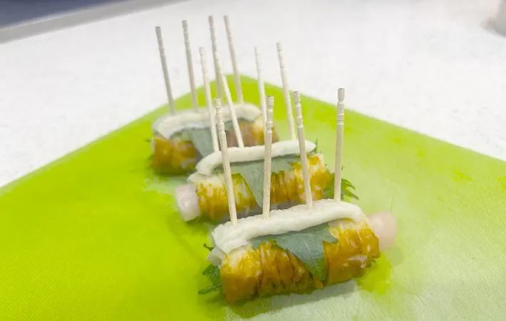 ひと巻きしたところで大葉を重ね、そのまま最後まで巻き上げましょう。