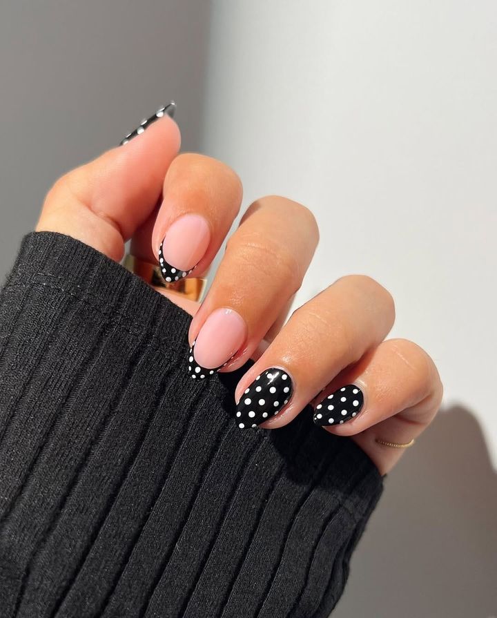 ヴィンテージ感たっぷりの黒のフレンチチップと水玉模様に夢中。上品さを保ちつつも、少し遊び心も加えたい時にぴったり。このキュートなネイルは、マニキュアのマンネリから抜け出すのにうってつけ。写真のように、指ごとに少しアクセントを加えるのも◎