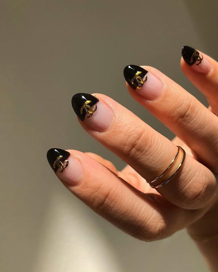 デザイナーネイルが手に入るなら、新しいデザイナーバッグに大金を費やす必要はない。太めの黒のフレンチチップでマニキュアを仕上げ、ずっと憧れていたバッグのロゴそっくりのゴールドデザインを描いてみては? あるいは、自分好みのゴールドのデカール(花、ハート、星、ドットなど)でもOK。